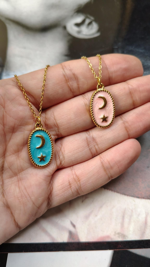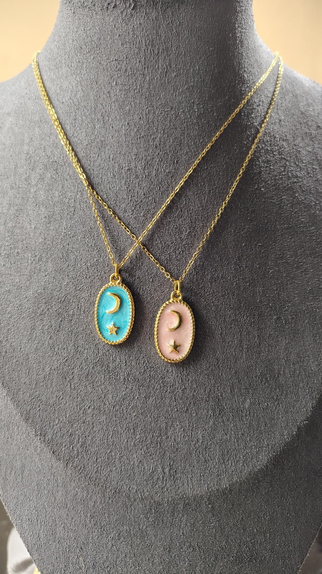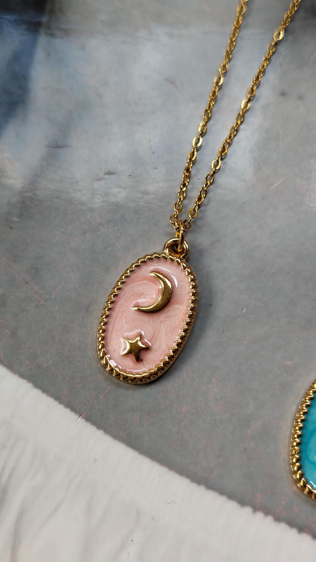 Collana in acciaio inossidabile con stella e mezzaluna effetto smaltato con rifiniture in oro. Lunghezza regolabile 40-45 cm.