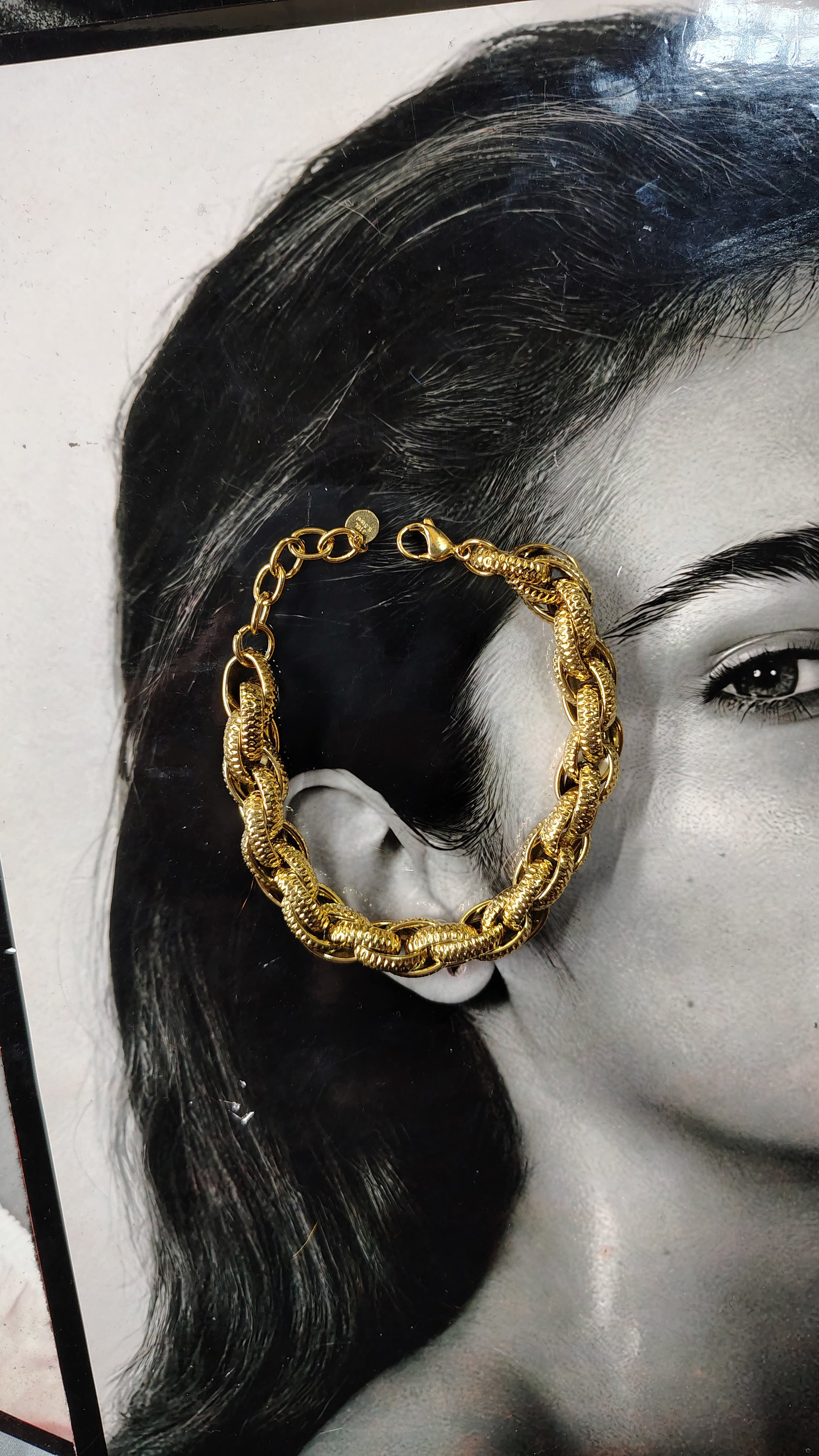 Bracciale carismatico e particolare per dare al tuo outfit un tocco importante ed estroverso, perfetto per chi vuole esternare la propria emotività attraverso un dettaglio che cattura lo sguardo. Catena doppia e intrecciata, lavorazione che ricorda la pelle di un serpente, tutto interamente in acciaio inossidabile con placcatura dorata brillante ed elegante. Lunghezza regolabile 17-22cm circa grazie alla catenina.