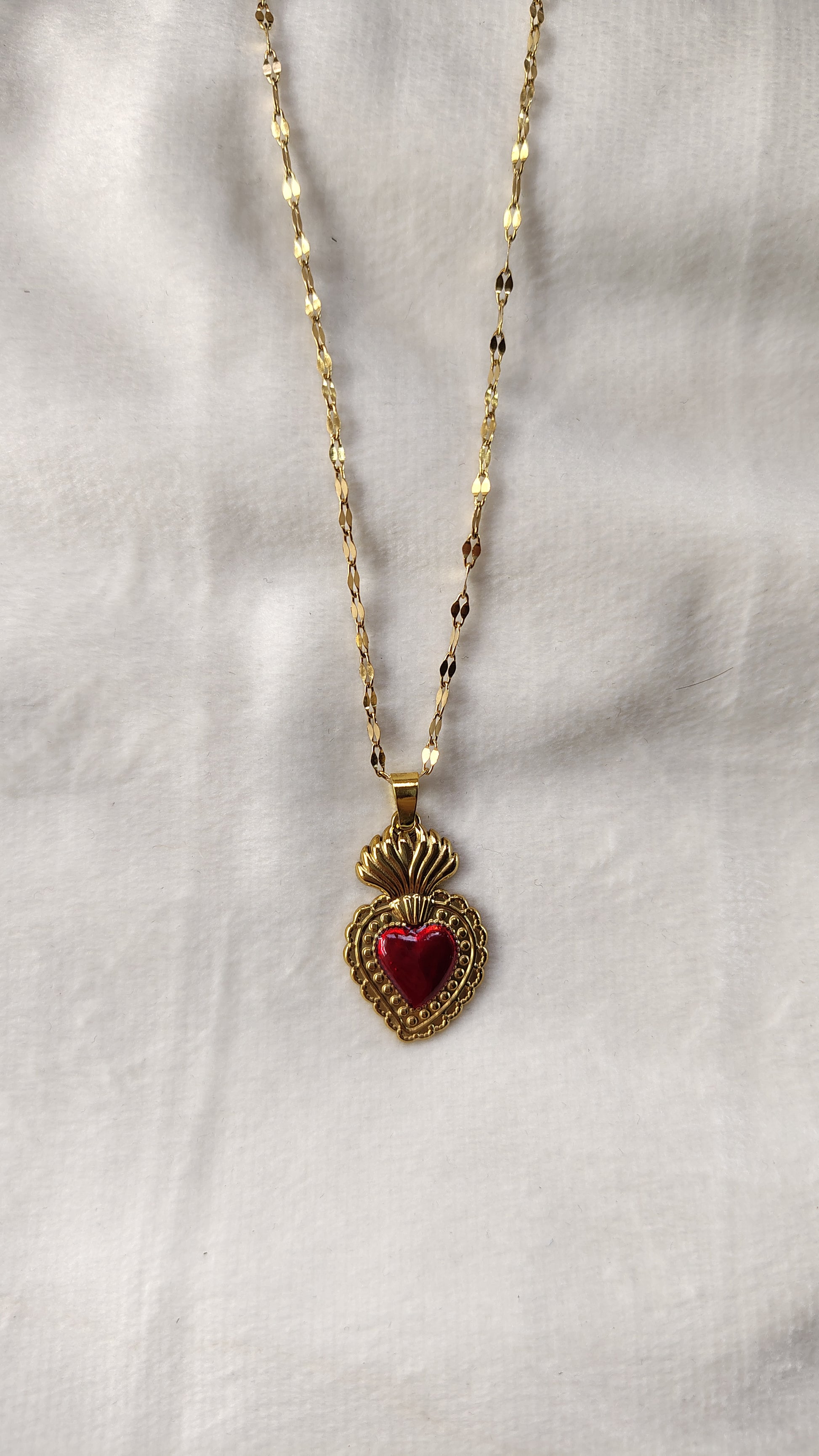 Questa collana si presenta con la catenina regolabile di circa 40-45cm e un pendente singolo raffigurante il Sacro Cuore smaltato di rosso per simboleggiare la passione con cornice dorata per rendere il concept carismatico ed elegante.