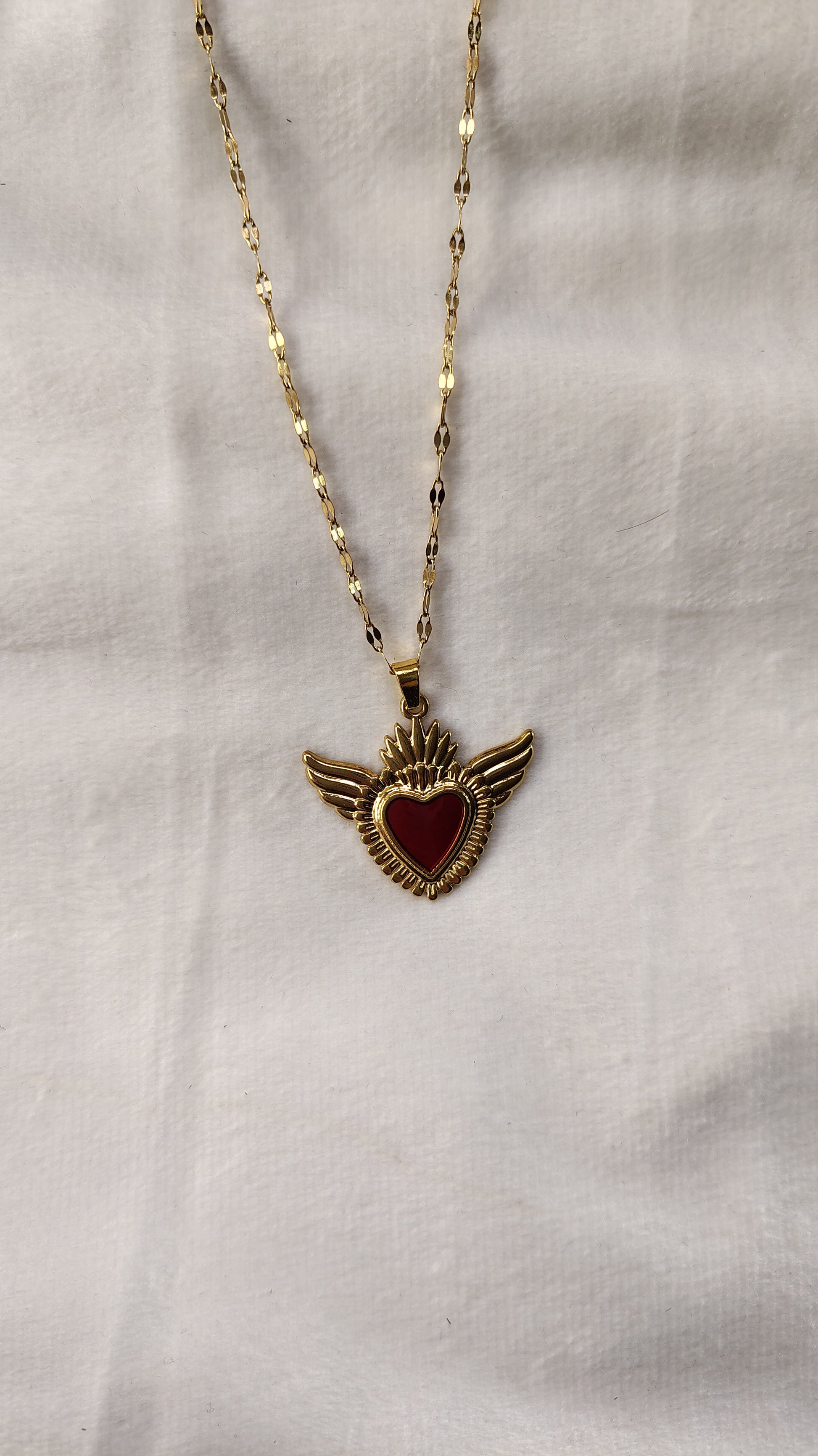 Questa collana in acciaio inossidabile è perfetta per chi vuole dare al proprio outfit colore e particolarità attraverso i dettagli. Infatti la collana è caratterizzata da un ciondolo singolo in cui è rappresentato il Sacro Cuore alato reso ancora più particolare dal tocco smaltato di colore rosso.