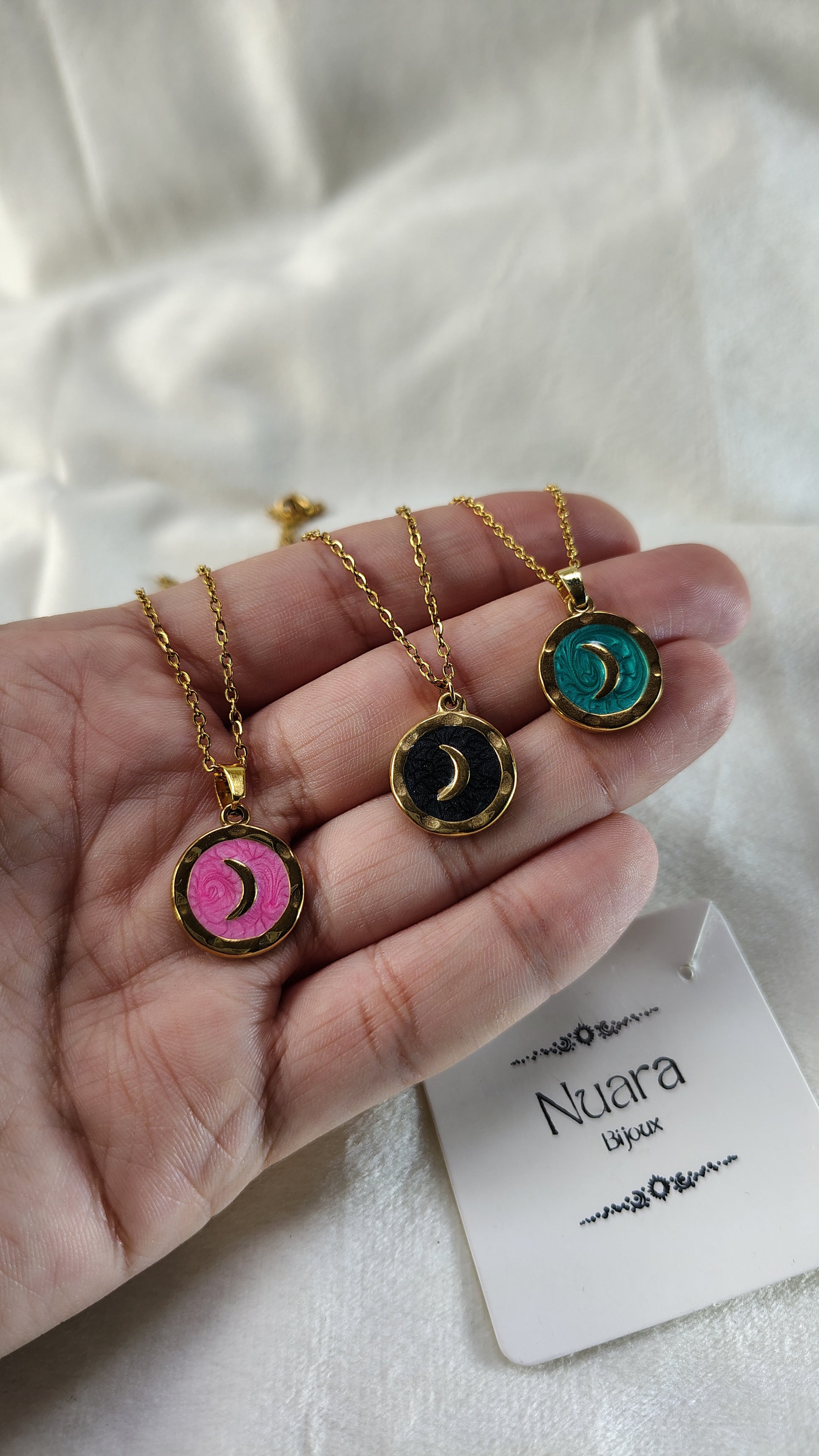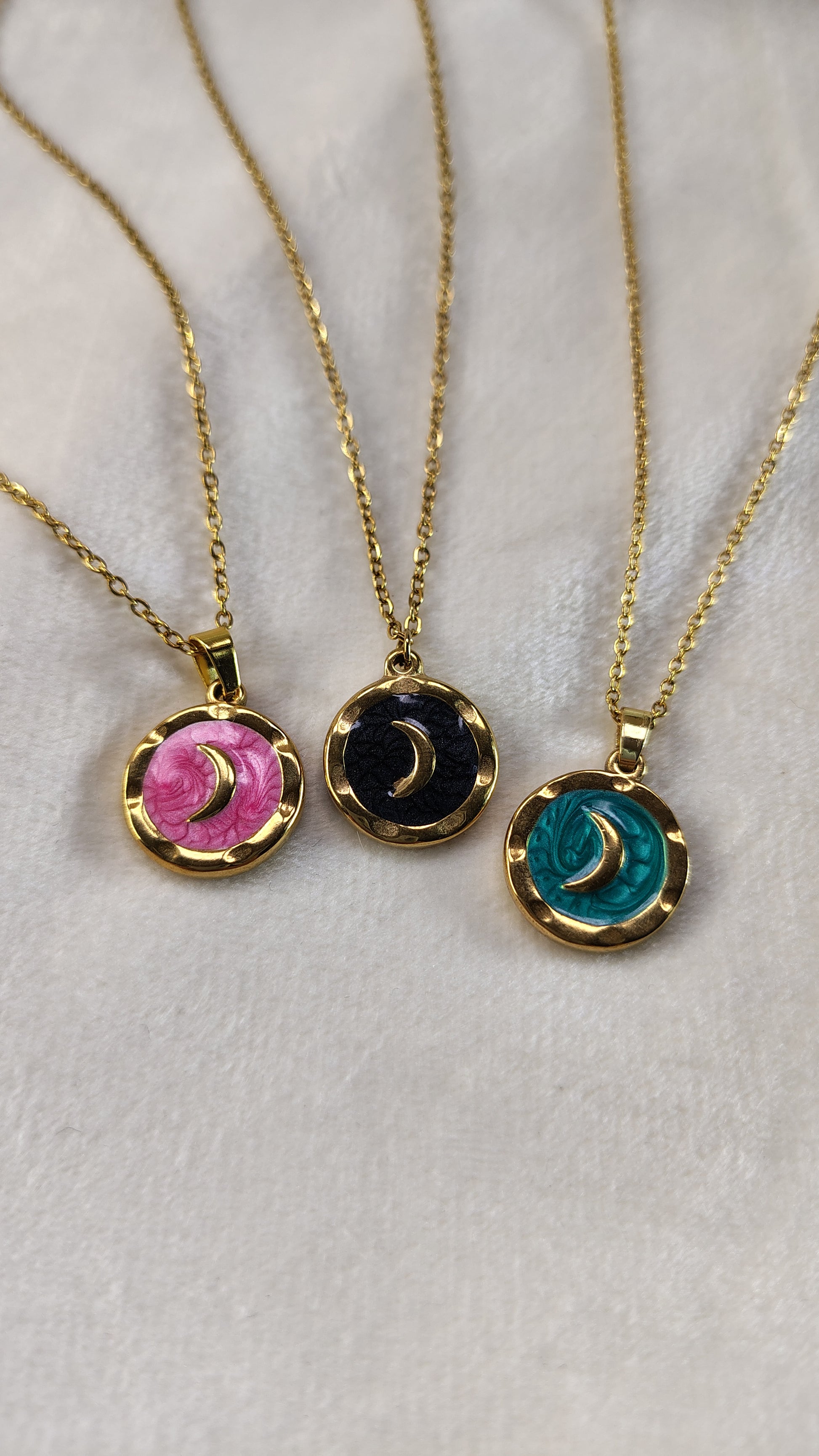 La mezzaluna è uno dei simboli poi misteriosi e antichi, può rappresentare la trasformazione, la ciclicità della vita ma anche lucentezza e tagliente erotismo. In questa collana viene messa in risalto dal fondo smaltato che crea un mix unico e particolare. Interamente in acciaio inossidabile, la catena è regolabile circa 45-50cm.
