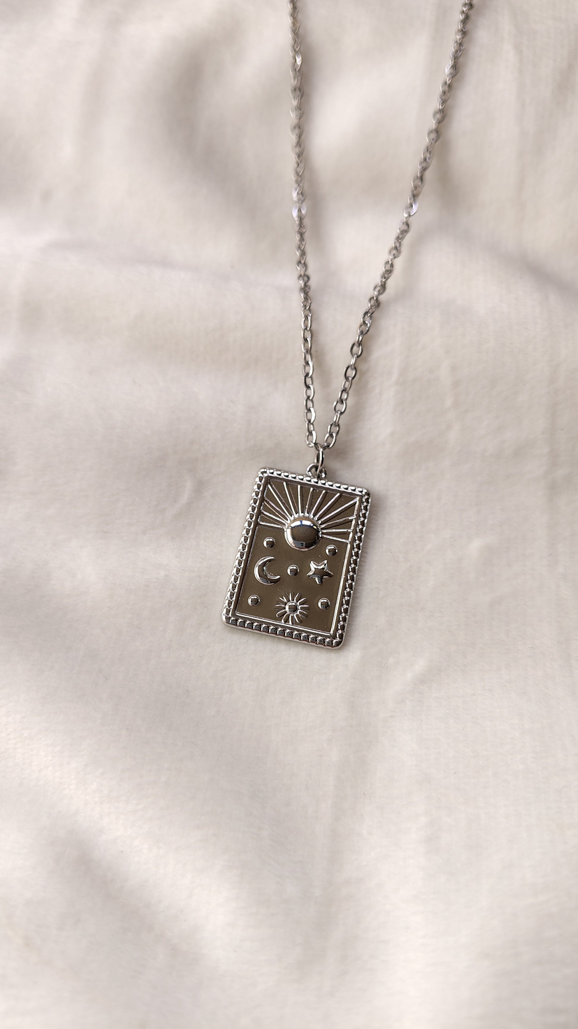 Questa collana regolabile Nuara Bijoux è realizzata in acciaio inossidabile color argento, resistente e luminoso, perfetto per chi desidera un bijoux elegante ma adatto all’uso quotidiano. Il ciondolo rettangolare inciso presenta simboli celesti – sole, luna e stelle – che richiamano equilibrio, protezione e luce interiore.