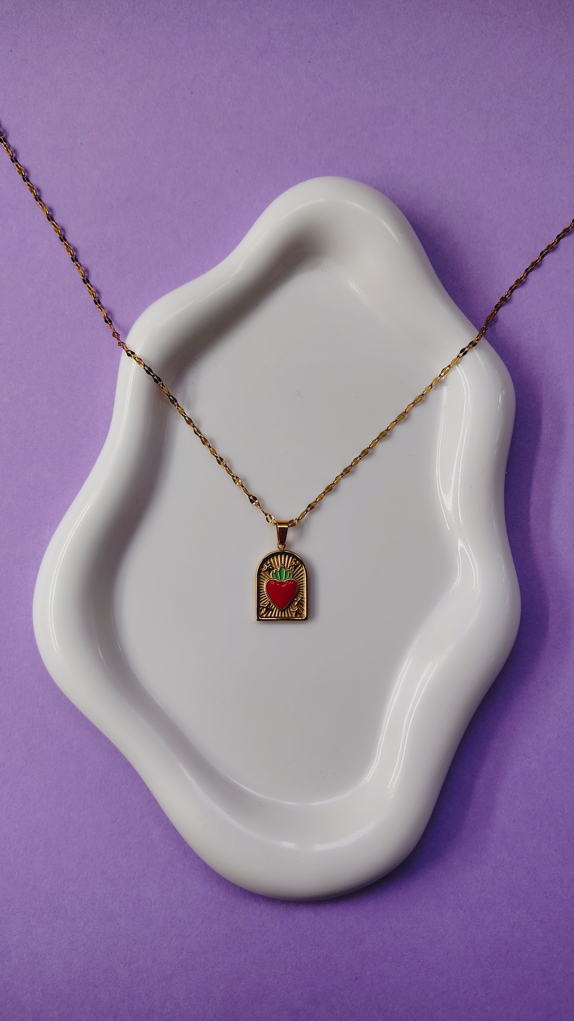 Incorniciato da raggi dorati e piccoli dettagli stellati, il cuore rosso smaltato vibra al centro del ciondolo come un battito visibile, intenso e protettivo.