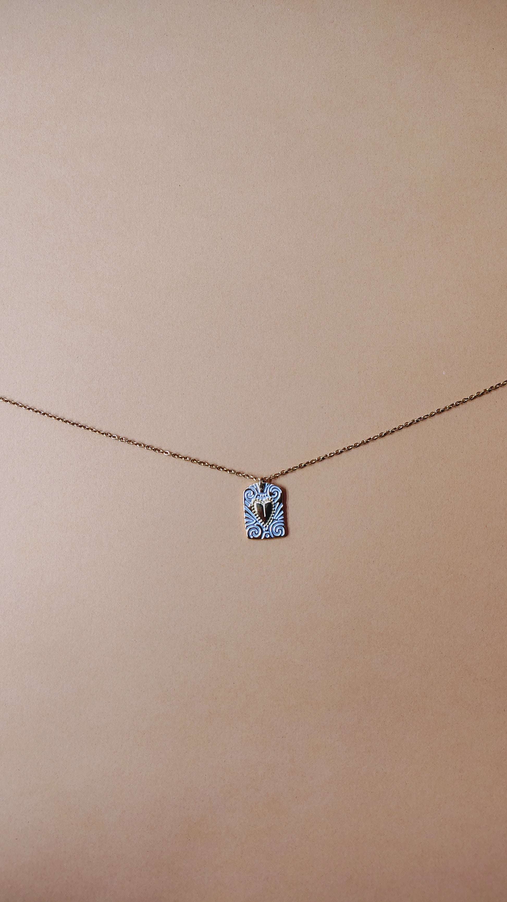 Questa collana si presenta con un ciondolo singolo raffigurante un cuore in rilievo con rifinitura in oro su fondo smaltato di colore bianco caratterizzato da linee astratte dorate. La forma del ciondolo è moderna e versatile.