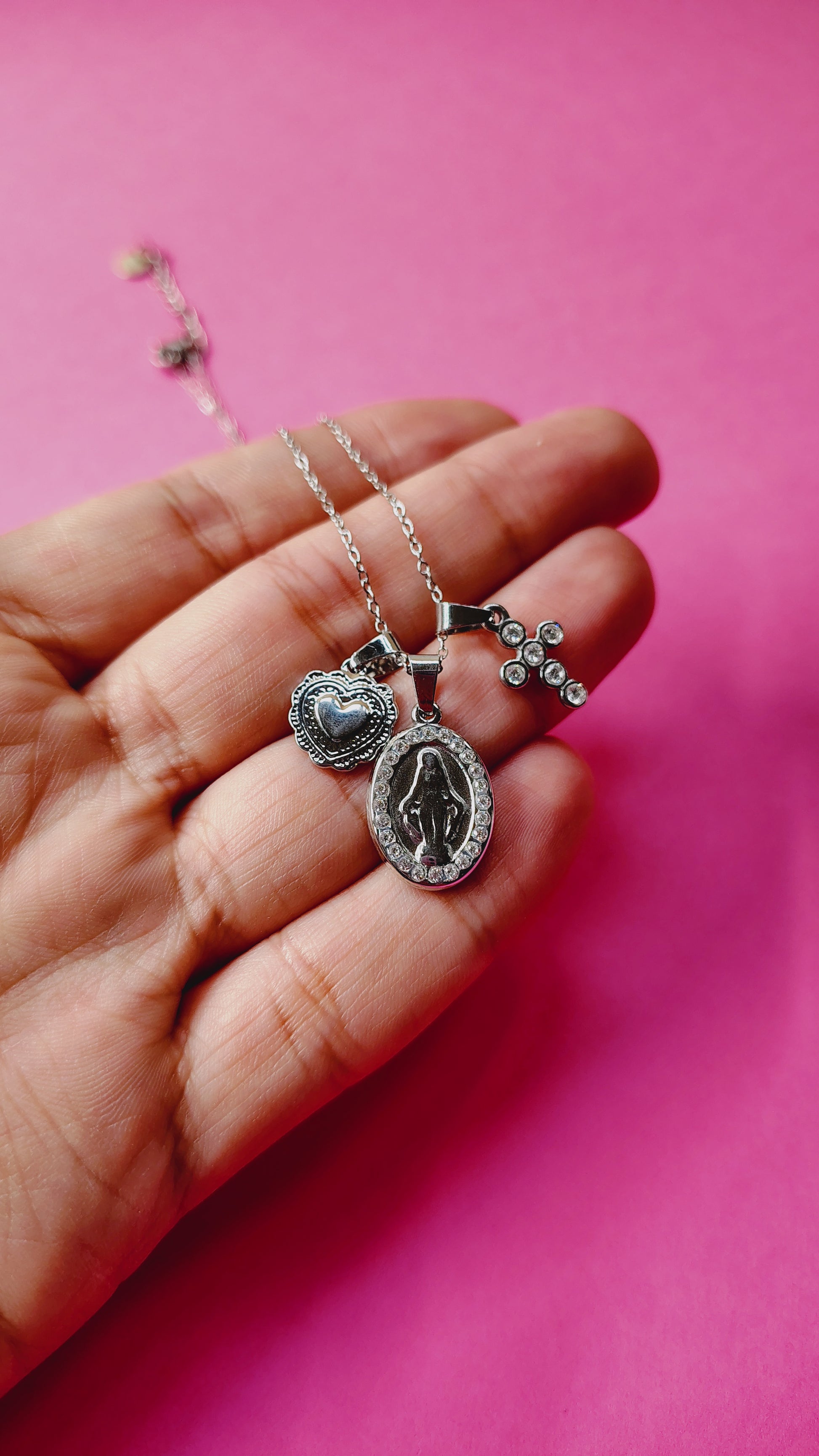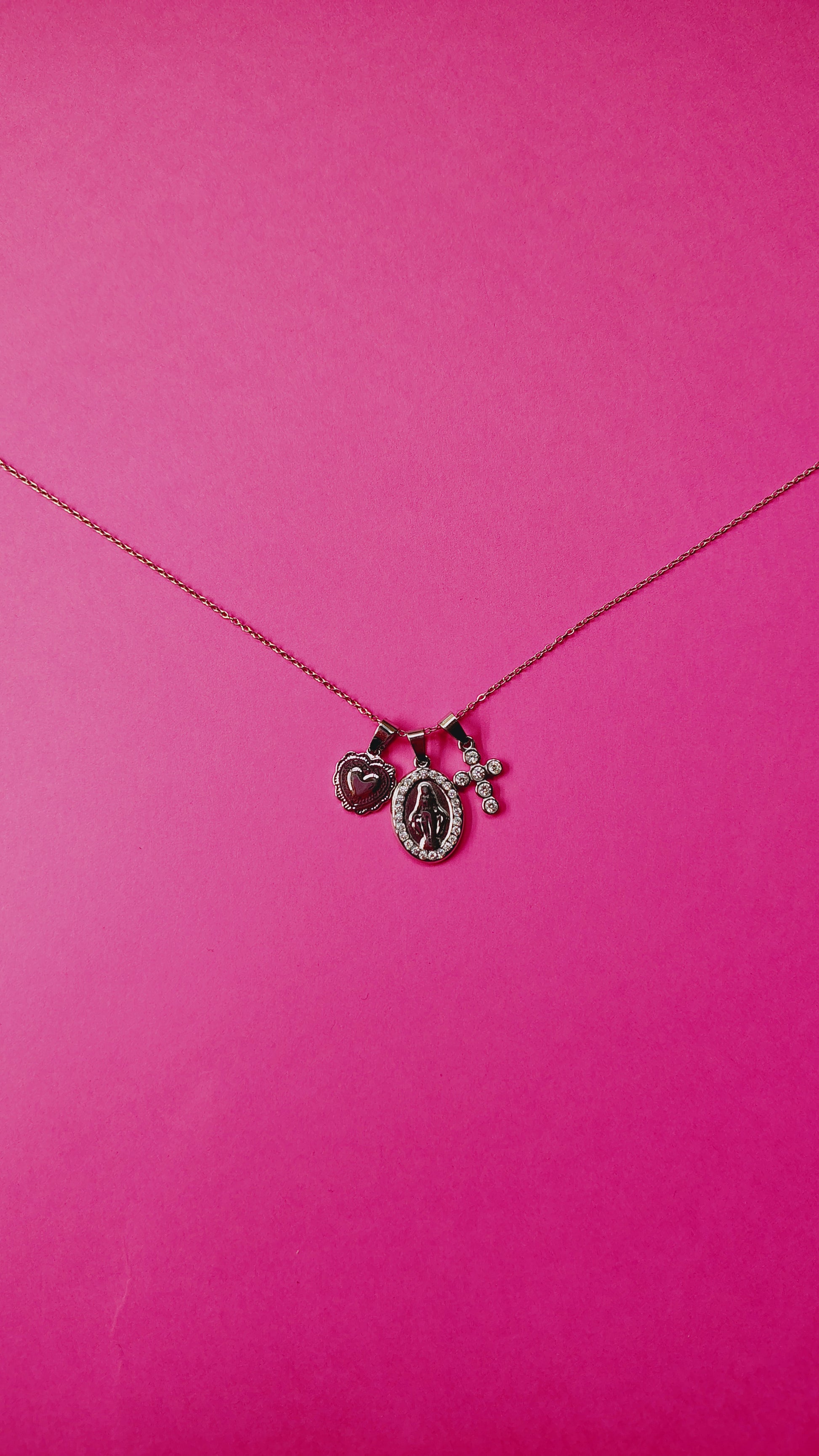 Questa collana si presenta con una catena regolabile caratterizzata da tre charms molto significativi come la croce di strass, il sacro cuore e la Madonnina in rilievo.