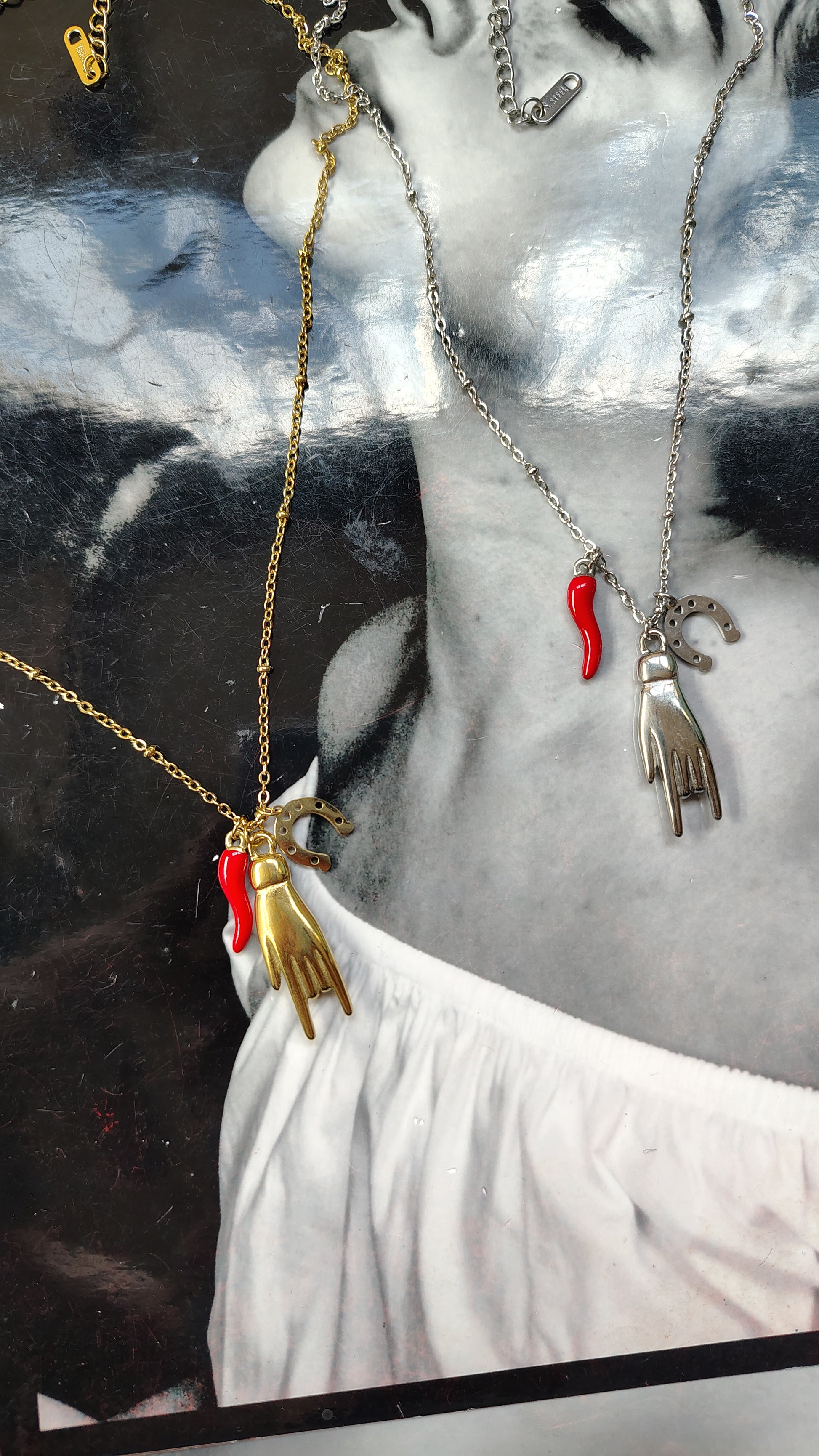 Presenta una catenina regolabile di 45-50cm, con l'aggiunta di tre ciondoli portafortuna: cornicello rosso, corna, ferro di cavallo.