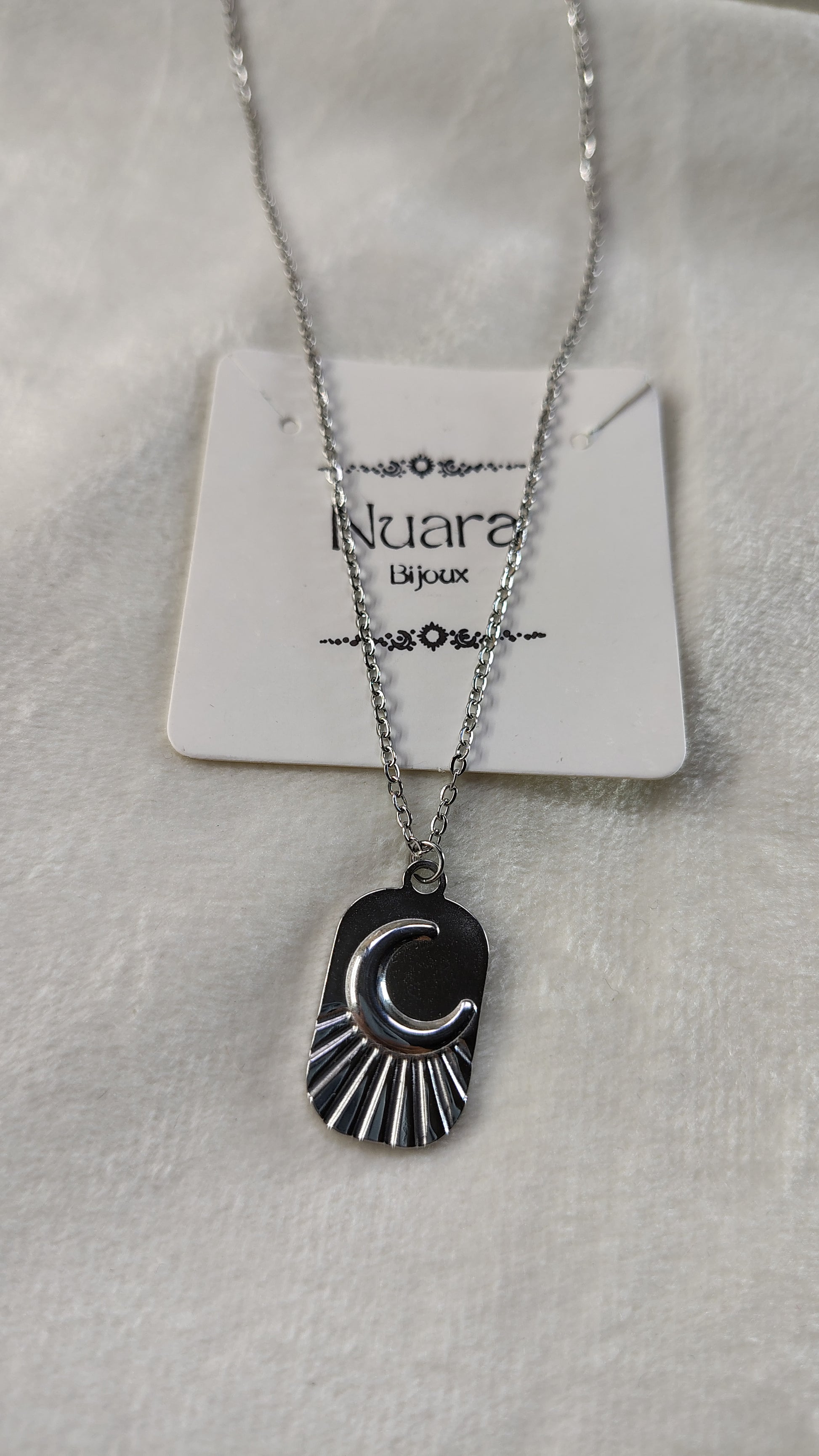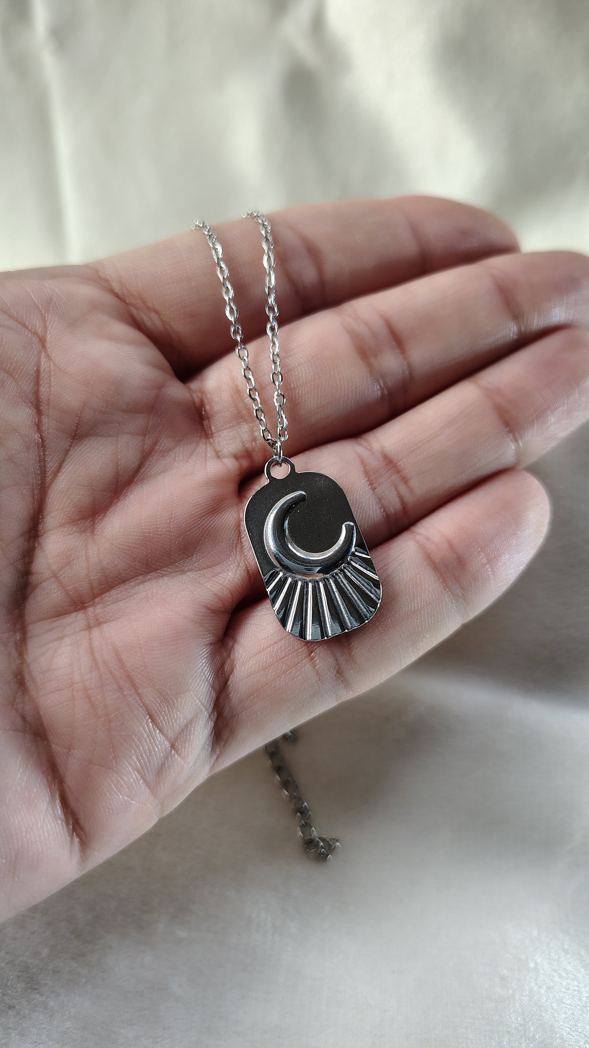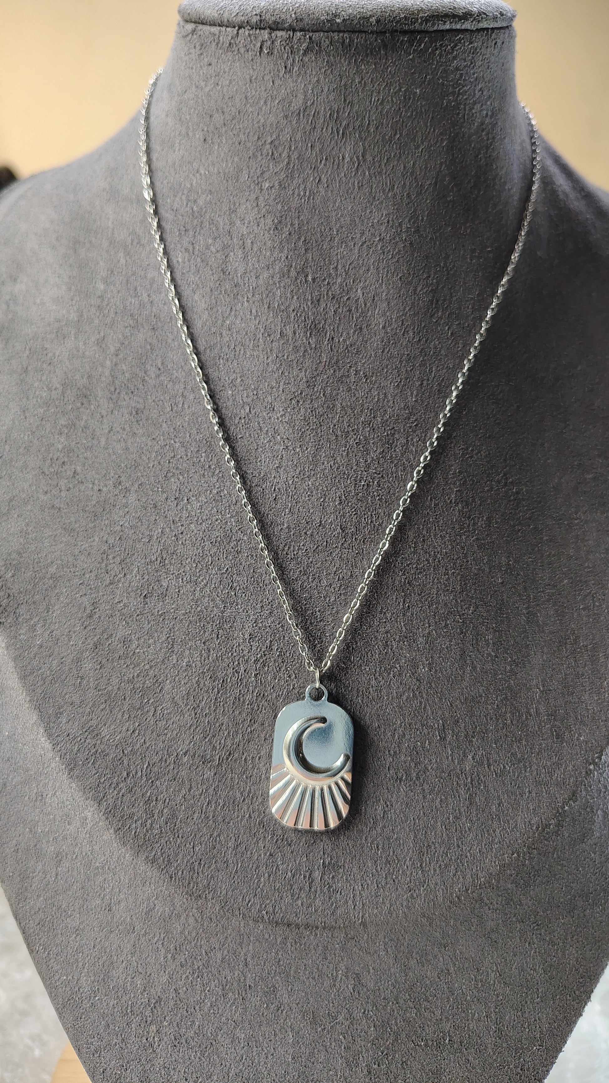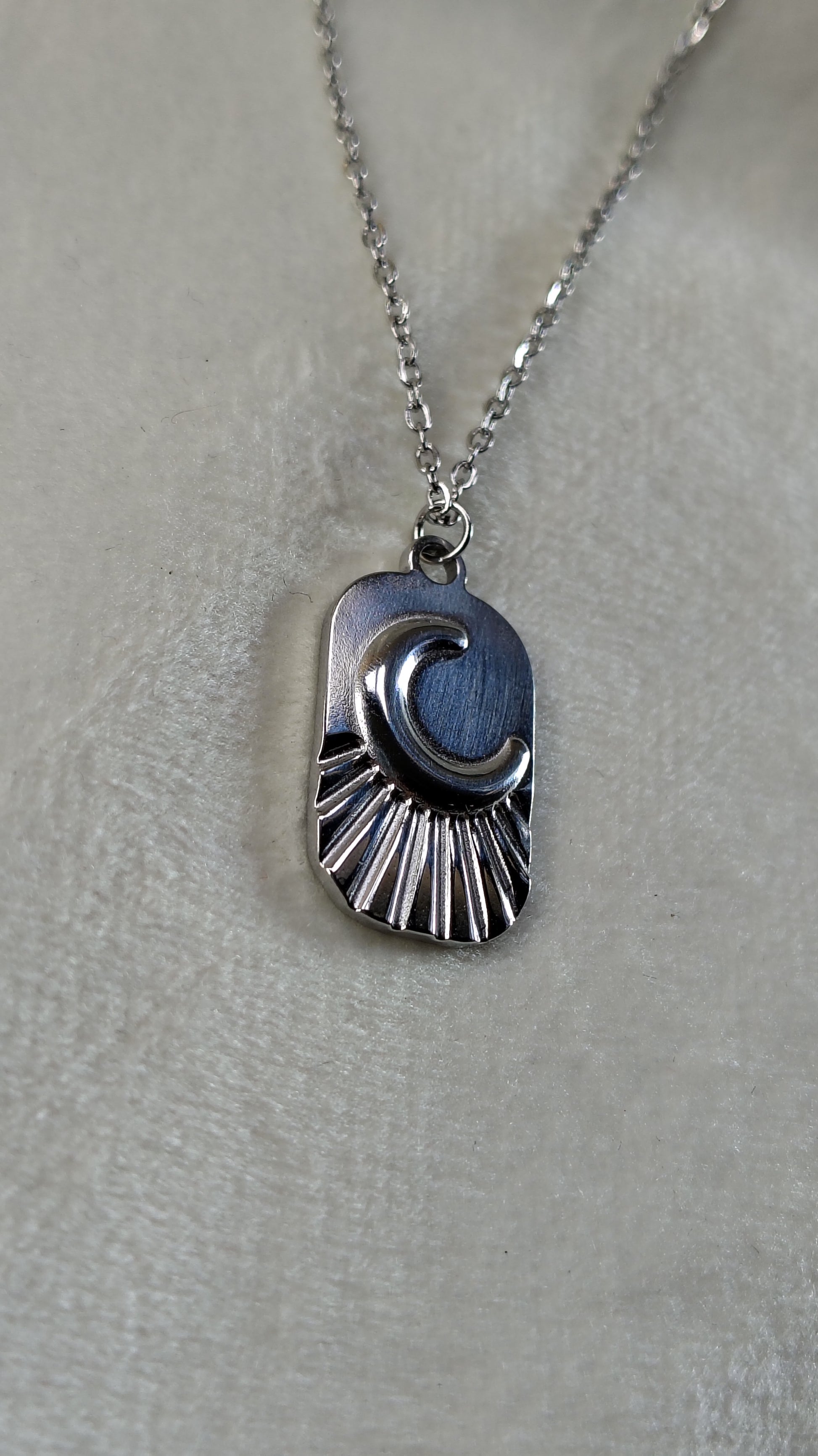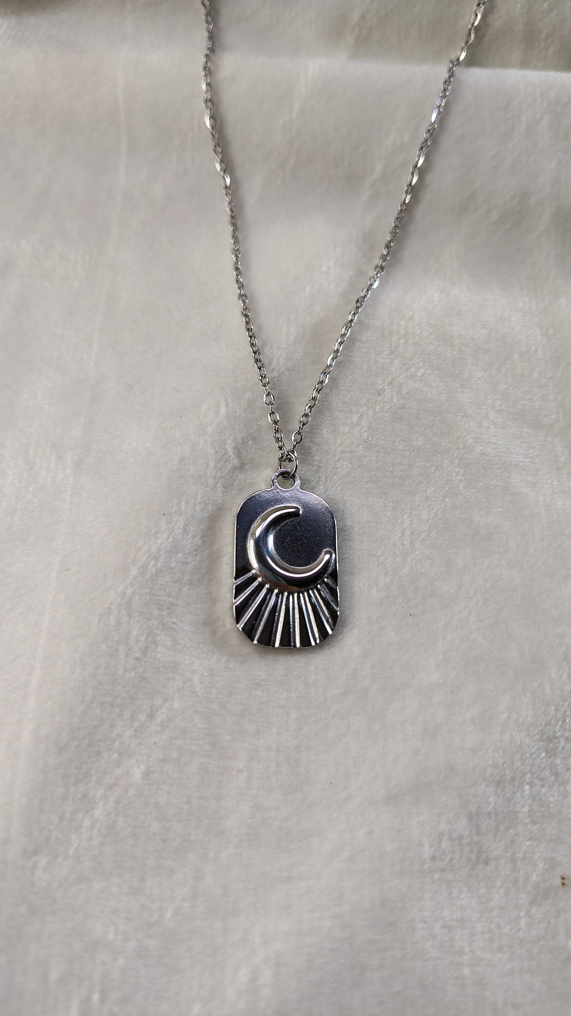 Collana in acciaio inossidabile con targhetta con simbolo mezzaluna in rilievo, molto versatile e particolare, perfetta da indossare in ogni tipo di occasione. La catenina è regolabile ed è lunga circa 40-45cm.