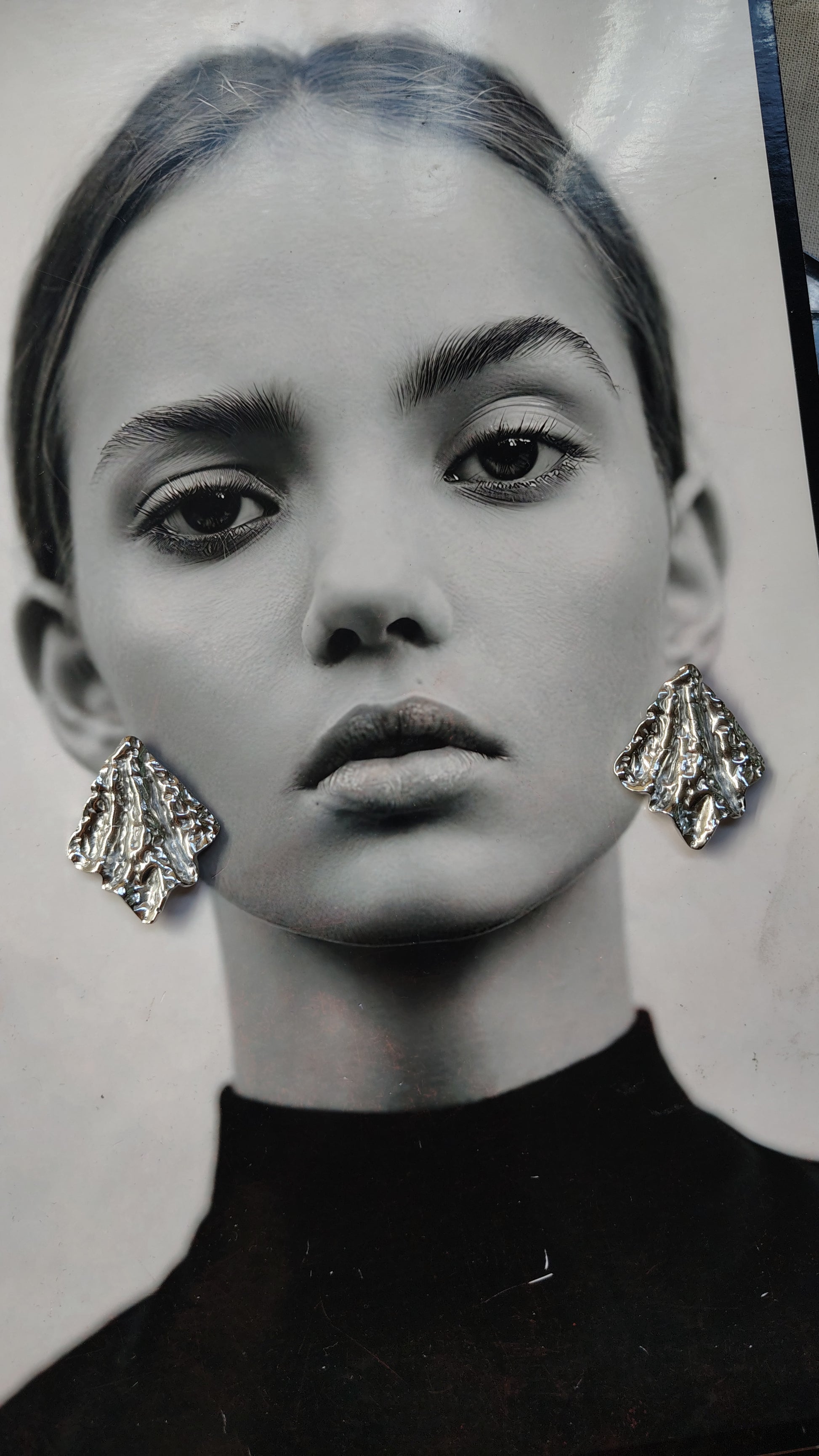 Gli orecchini Nuara Bijoux sono realizzati in acciaio inossidabile color argento e si distinguono per il loro design scultoreo e irregolare, ispirato alle superfici naturali e alla bellezza non convenzionale. La texture martellata crea riflessi unici, rendendo ogni orecchino visivamente intenso e moderno.