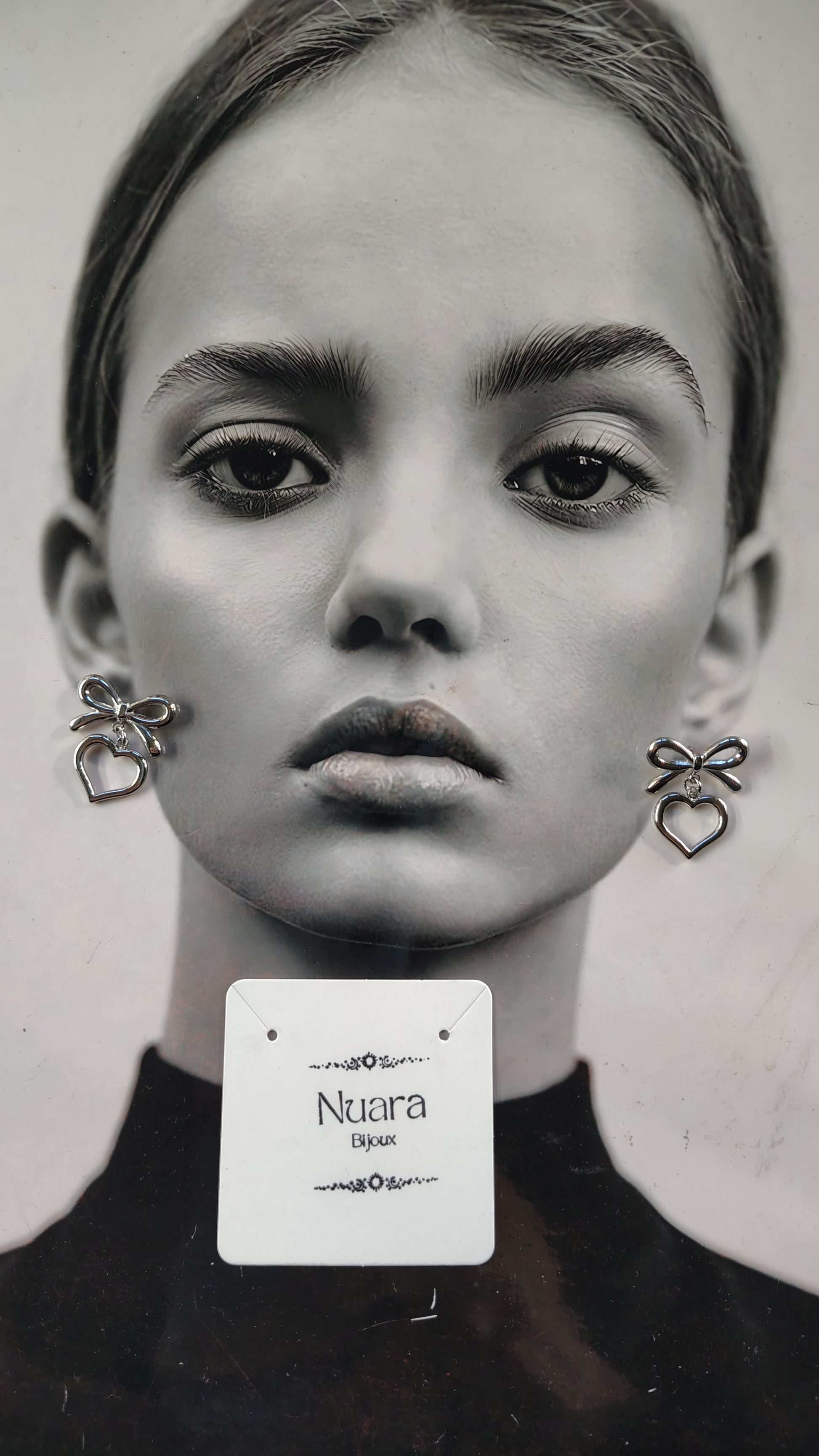 Gli orecchini Nuara Bijoux sono realizzati in acciaio inossidabile color argento e presentano un elegante design composto da un fiocco lucido da cui pende un cuore aperto, leggero e armonioso. Le linee morbide e pulite li rendono raffinati ma facili da indossare ogni giorno.